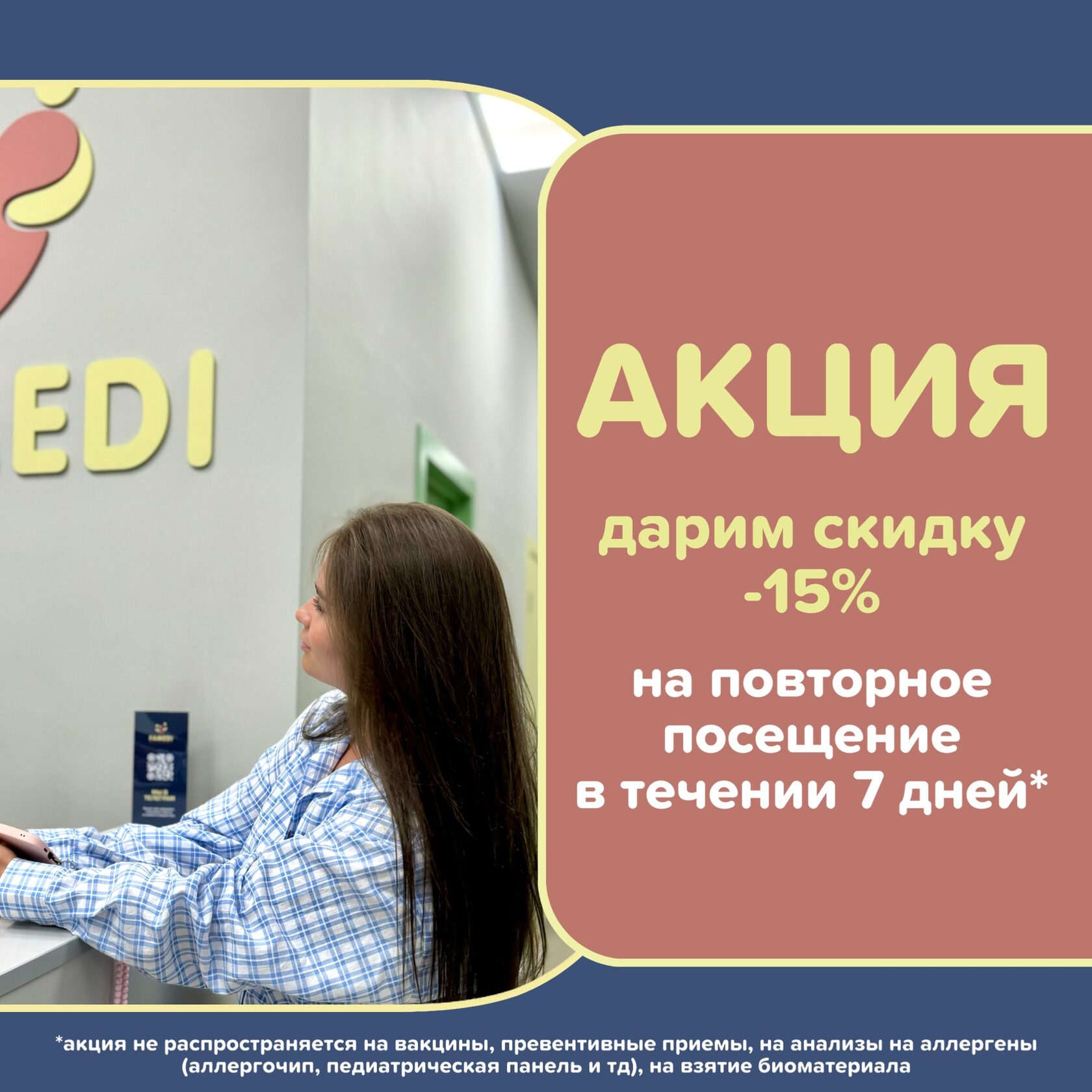 *акция не распространяется на вакцины, превентивные приемы, на анализы на аллергены (аллергочип, педиатрическая панель и тд), на взятие биоматериала